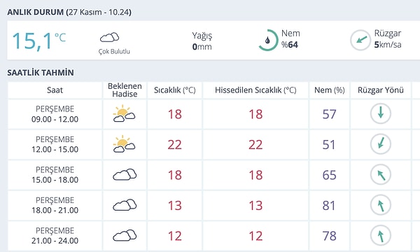 Yapılan son tahminlere göre, kentte hava sıcaklıklarının gün içinde artması bekleniyor. Değerlendirmelere sıcaklıklarda akşam saatlerine doğru düşüş beklenirken nem oranı %64 olarak ölçüldü.