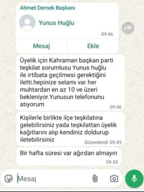 Dernek Başkanı muhtarlara gönderdiği bir başka mesajda ise, AKP Teşkilat Sorumlusu Yunus Huğlu’nun numarasını paylaşarak kendisiyle üyeler ile ilgili irtibata geçmelerini istedi.