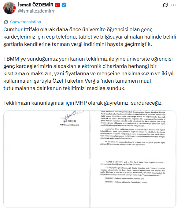 MHP Genel Başkan Yardımcısı İsmail Özdemir, sosyal medya hesabından yaptığı paylaşımda, dikkat çeken bir açıklamada bulundu. Üniversite öğrencilerinin, satın alacakları elektronik cihazlarda Özel Tüketim Vergisi’nden (ÖTV) tamemen muaf tutulmaları amacıyla Meclis’e kanun teklifi sunduklarını ifade eden Özdemir, “Cumhur İttifakı olarak daha önce üniversite öğrencisi olan genç kardeşlerimiz için cep telefonu, tablet ve bilgisayar almaları halinde belirli şartlarla kendilerine tanınan vergi indirimini hayata geçirmiştik.” ifadelerini kullandı.